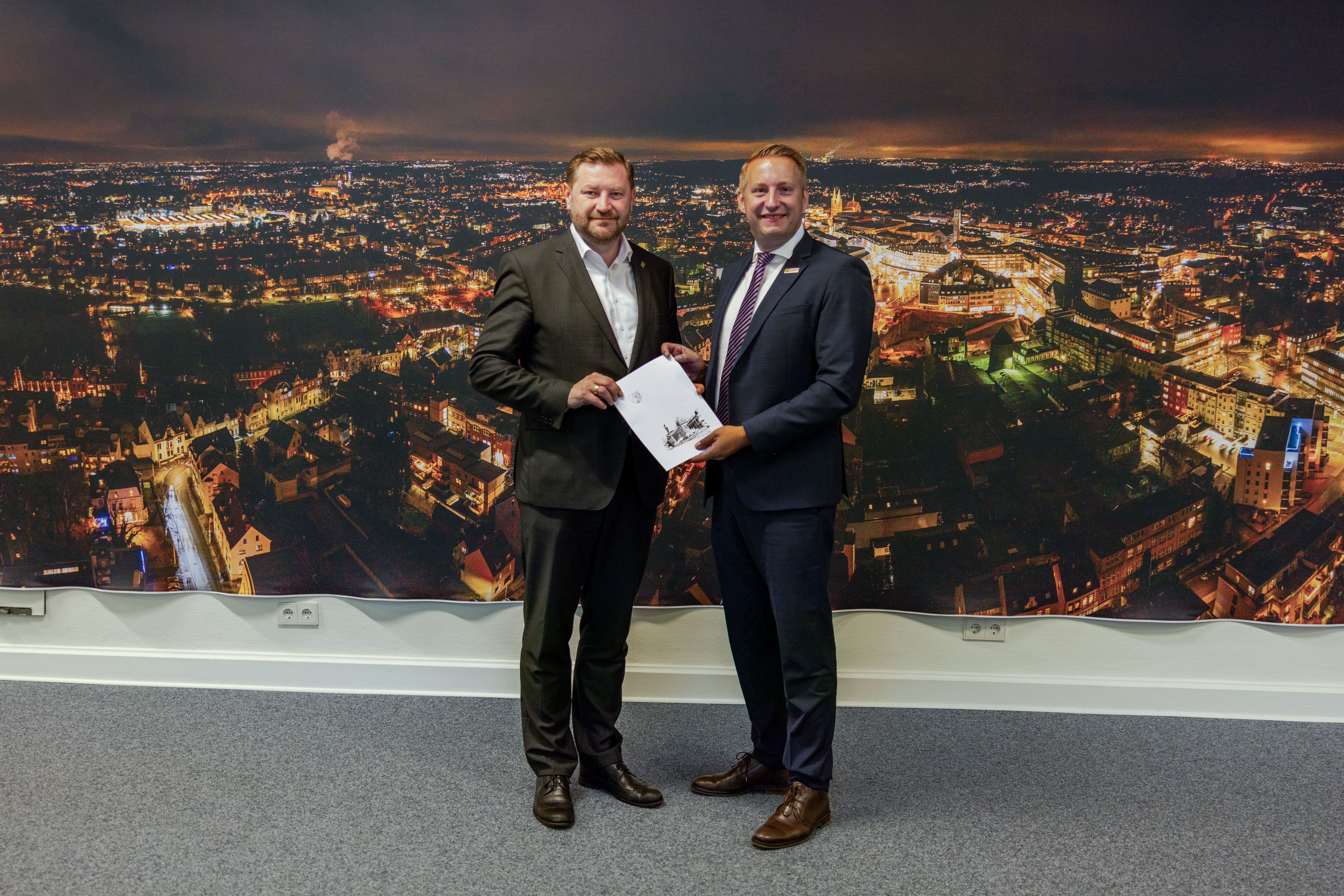 Regierungspräsident Thomas Schürmann (rechts) übergibt den Förderbescheid an Oberbürgermeister Tim Kurzbach.