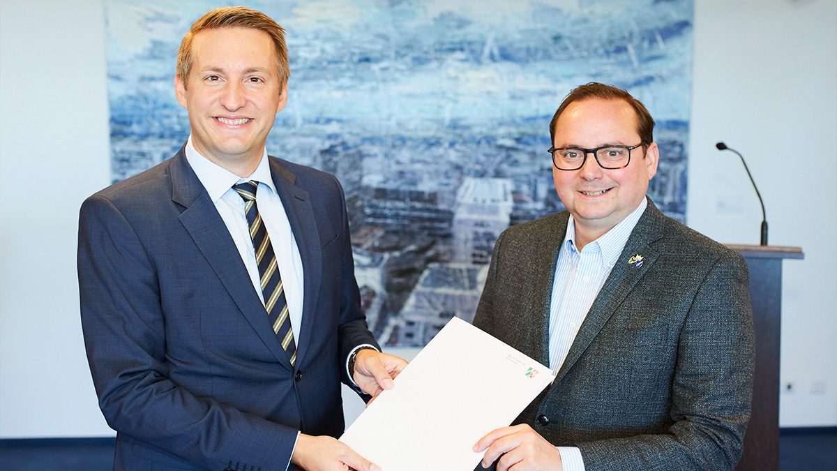 Thomas Schürmann überreicht Thomas Kufen den Fördermittelbescheid